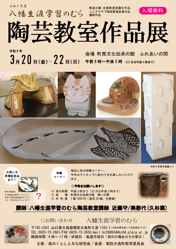 | 場所 | 山口県大島郡周防大島町久賀1102−1 八幡生涯学習のむら 町衆文化伝承の館 ふれあいの間 |